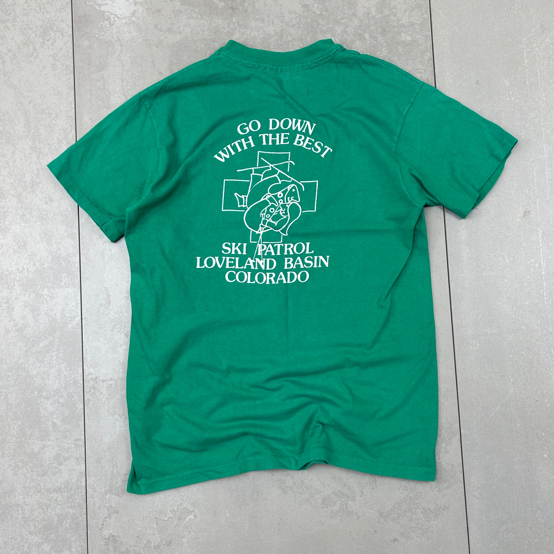 Vintage 90s Single Stitch Skiing Graphic Green T-Shirt - S
