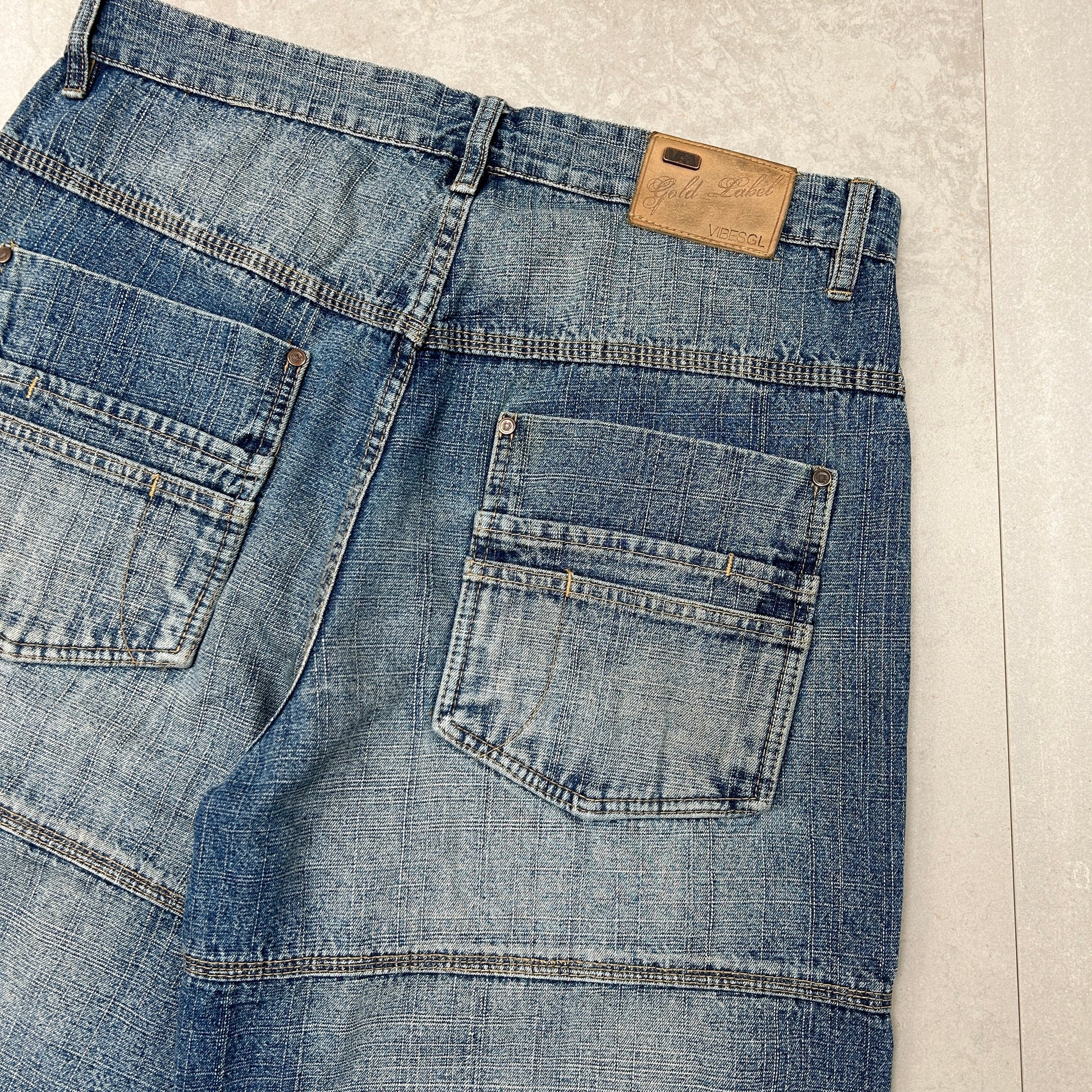 Contrast stitch true religion JNCO Coogi Southpole akademics Fubu skate rocawear embroidered denim jeans jorts skatewear surfwear carpenter cargo japanese denim