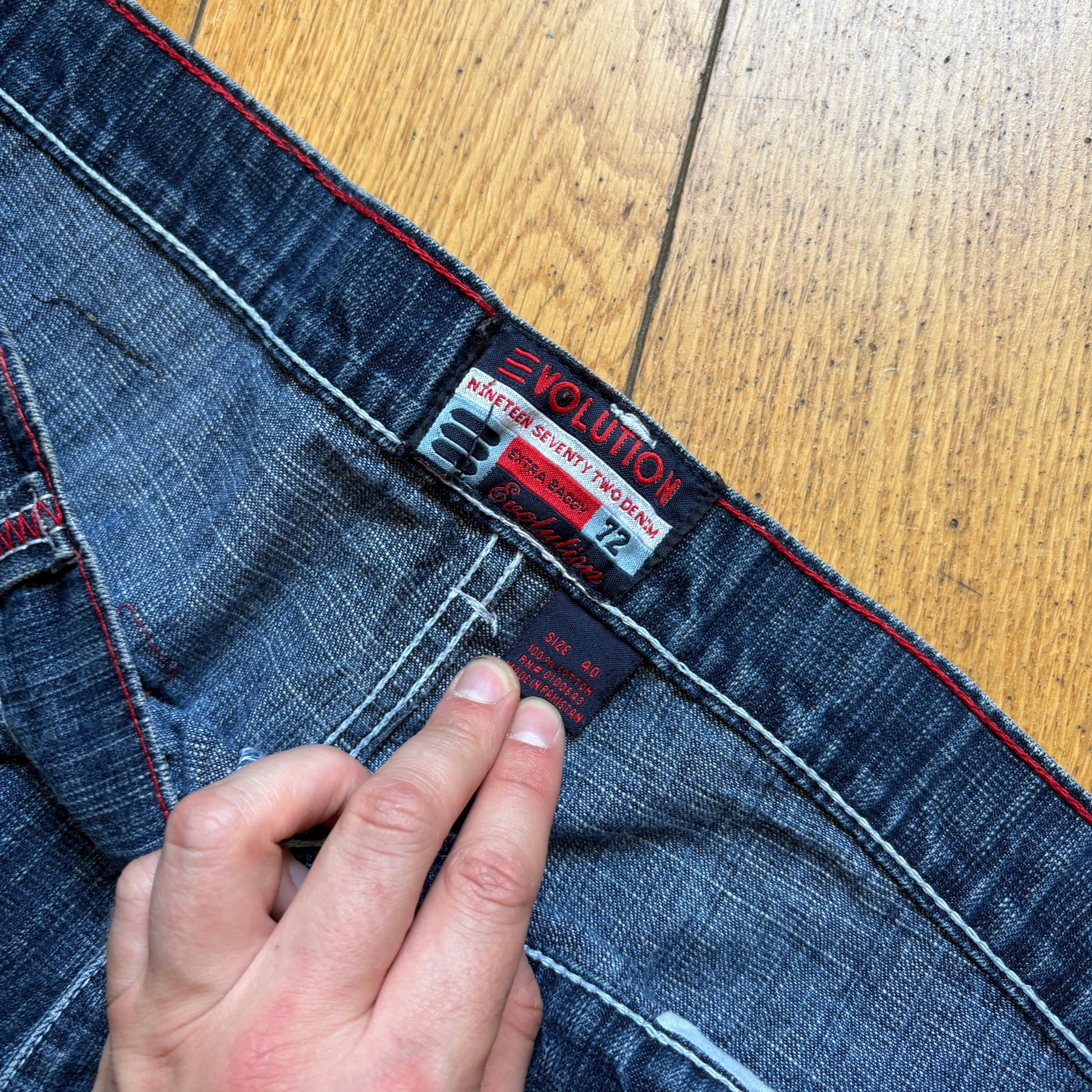 Contrast stitch true religion JNCO Coogi Southpole akademics Fubu skate rocawear embroidered denim jeans jorts skatewear surfwear carpenter cargo japanese denim