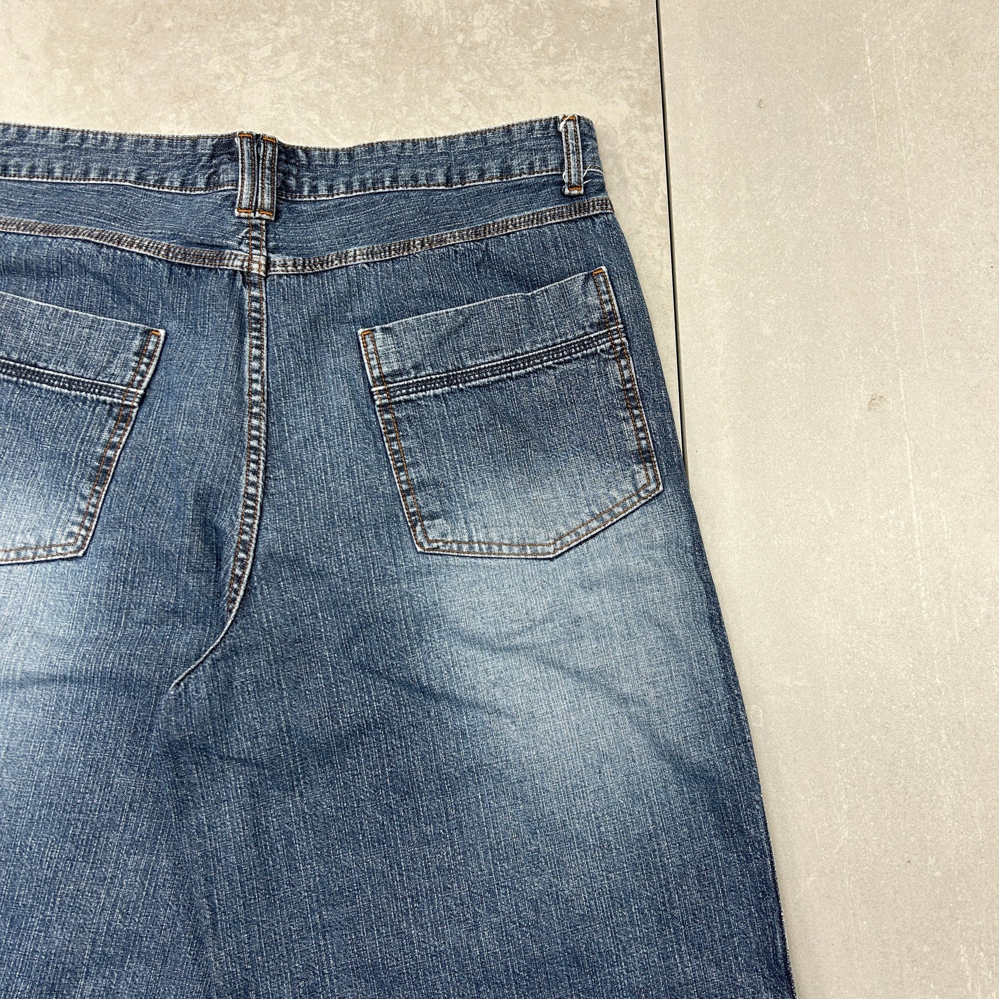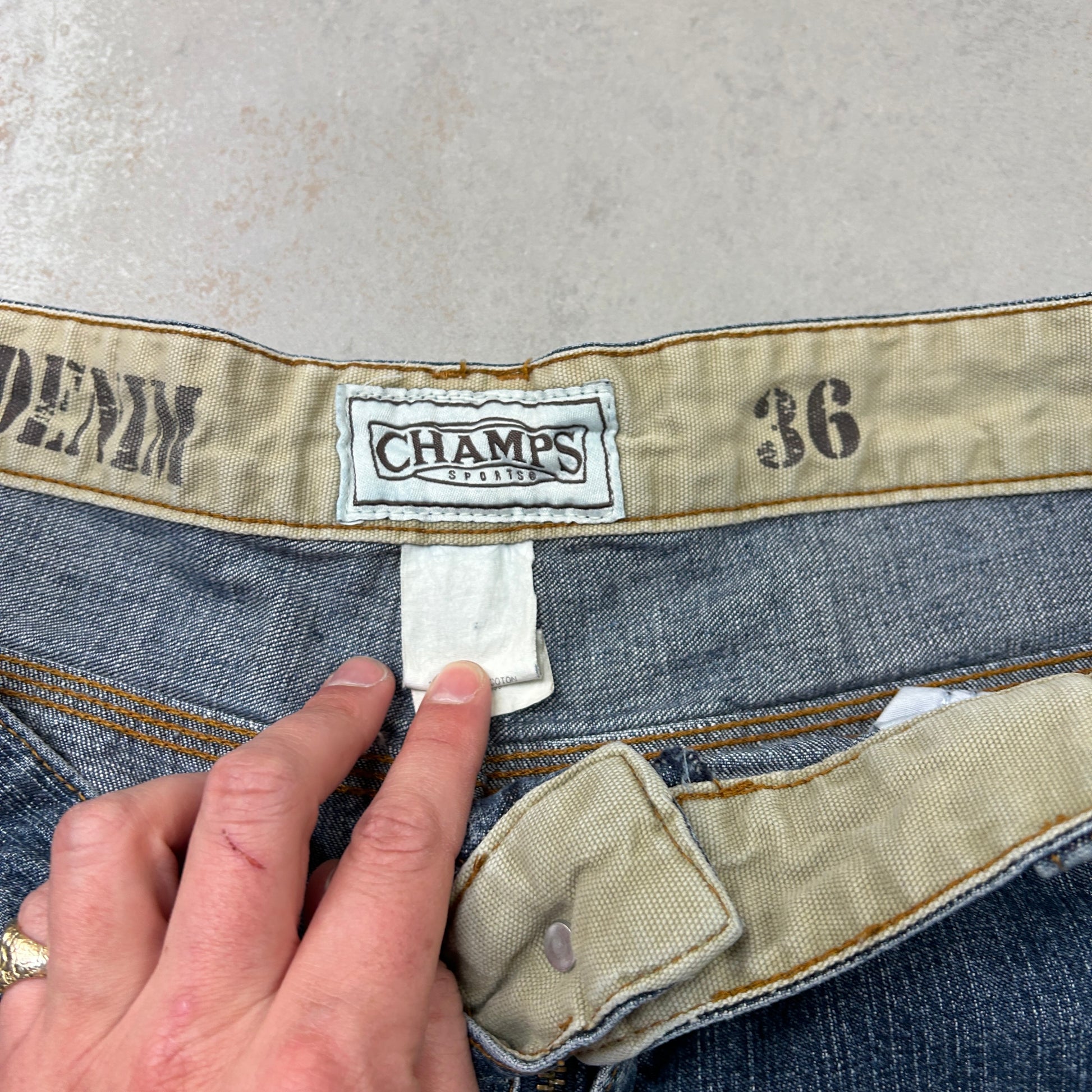 Contrast stitch true religion JNCO Coogi Southpole akademics Fubu skate rocawear embroidered denim jeans jorts skatewear surfwear carpenter cargo japanese denim