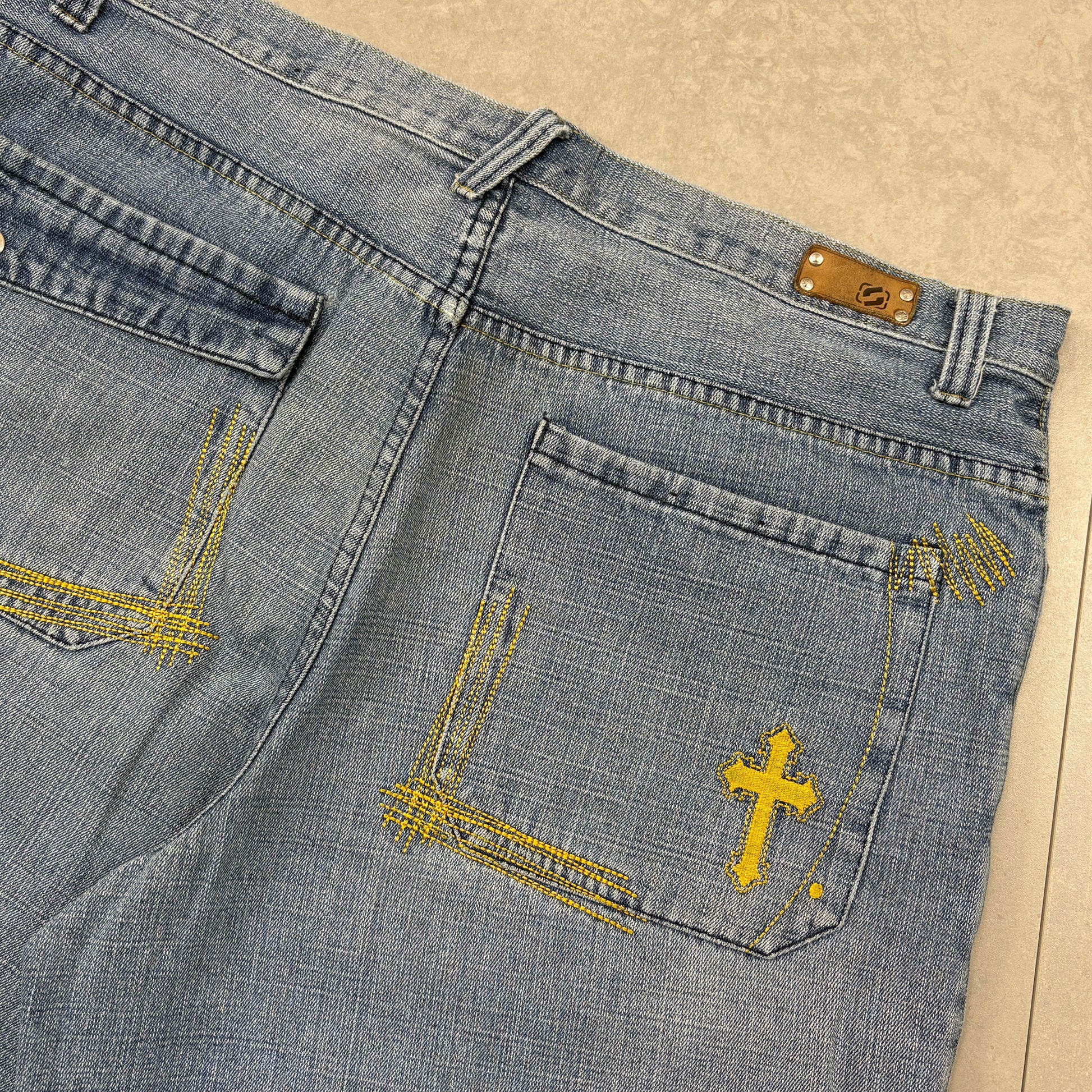 Contrast stitch true religion JNCO Coogi Southpole akademics Fubu skate rocawear embroidered denim jeans jorts skatewear surfwear carpenter cargo japanese denim
