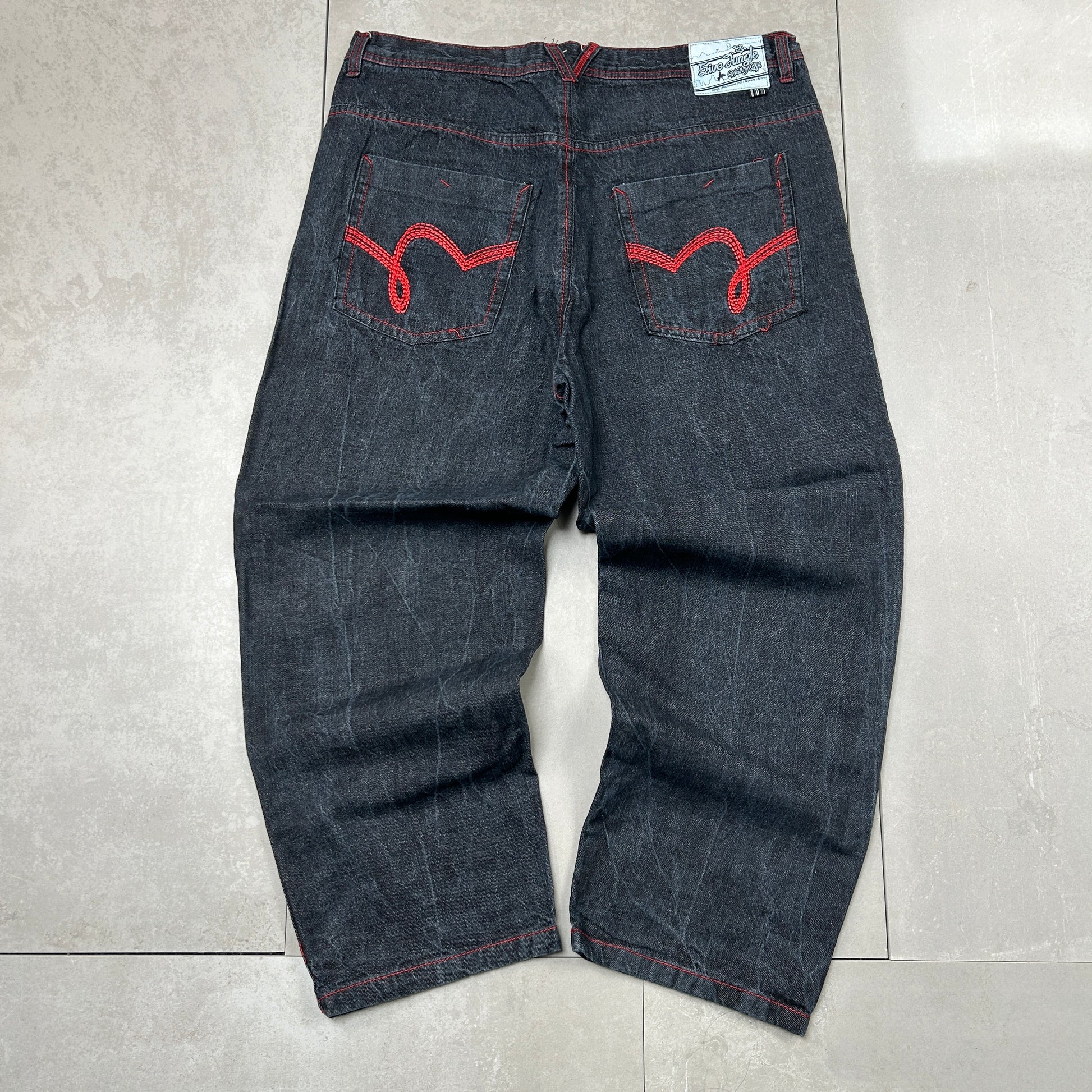 Vintage Embroidered Hip Hop Black Red Baggy Jeans - 42
