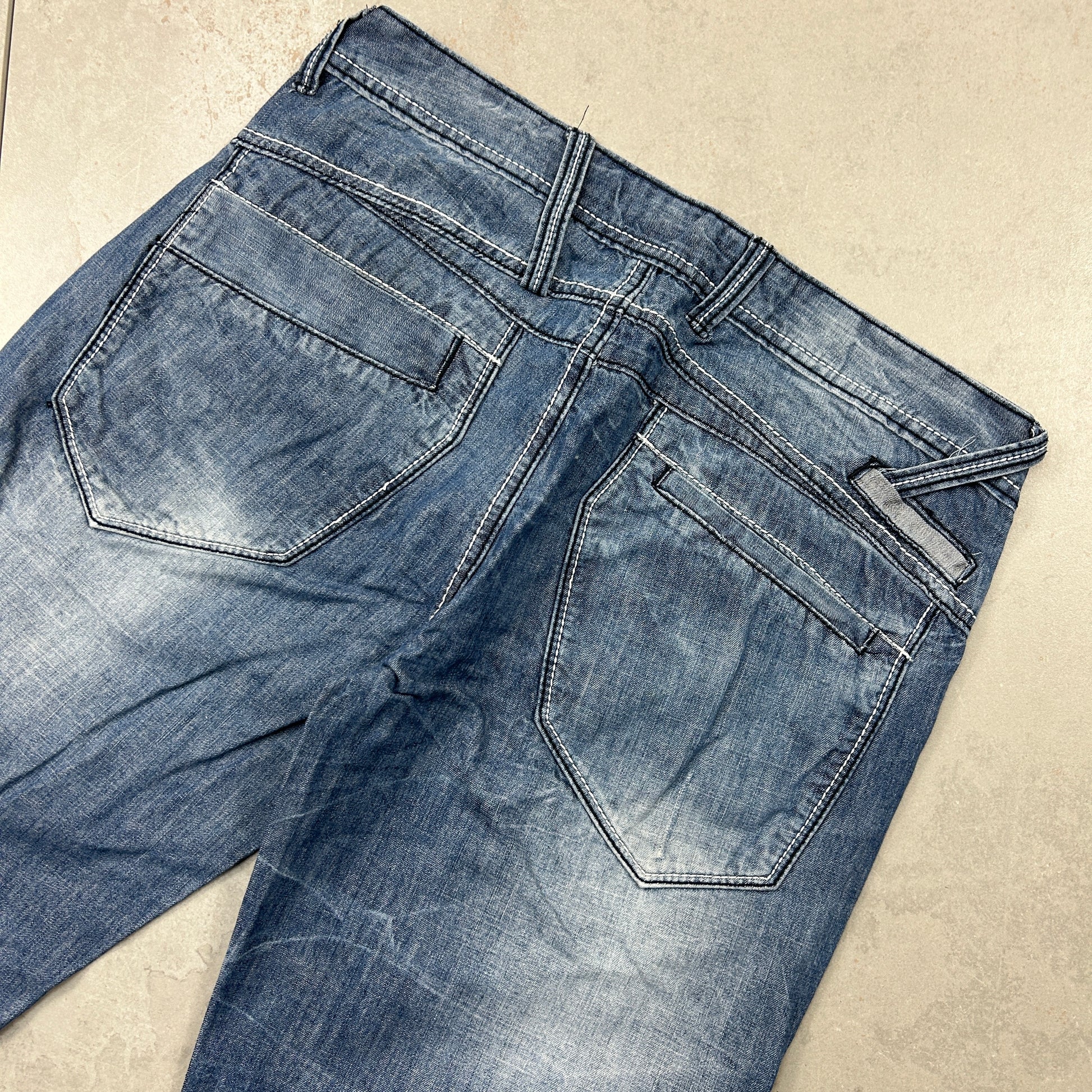 Contrast stitch true religion JNCO Coogi Southpole akademics Fubu skate rocawear embroidered denim jeans jorts skatewear surfwear carpenter cargo japanese denim