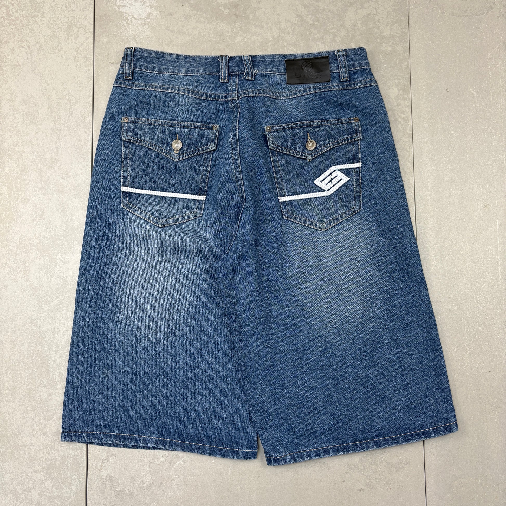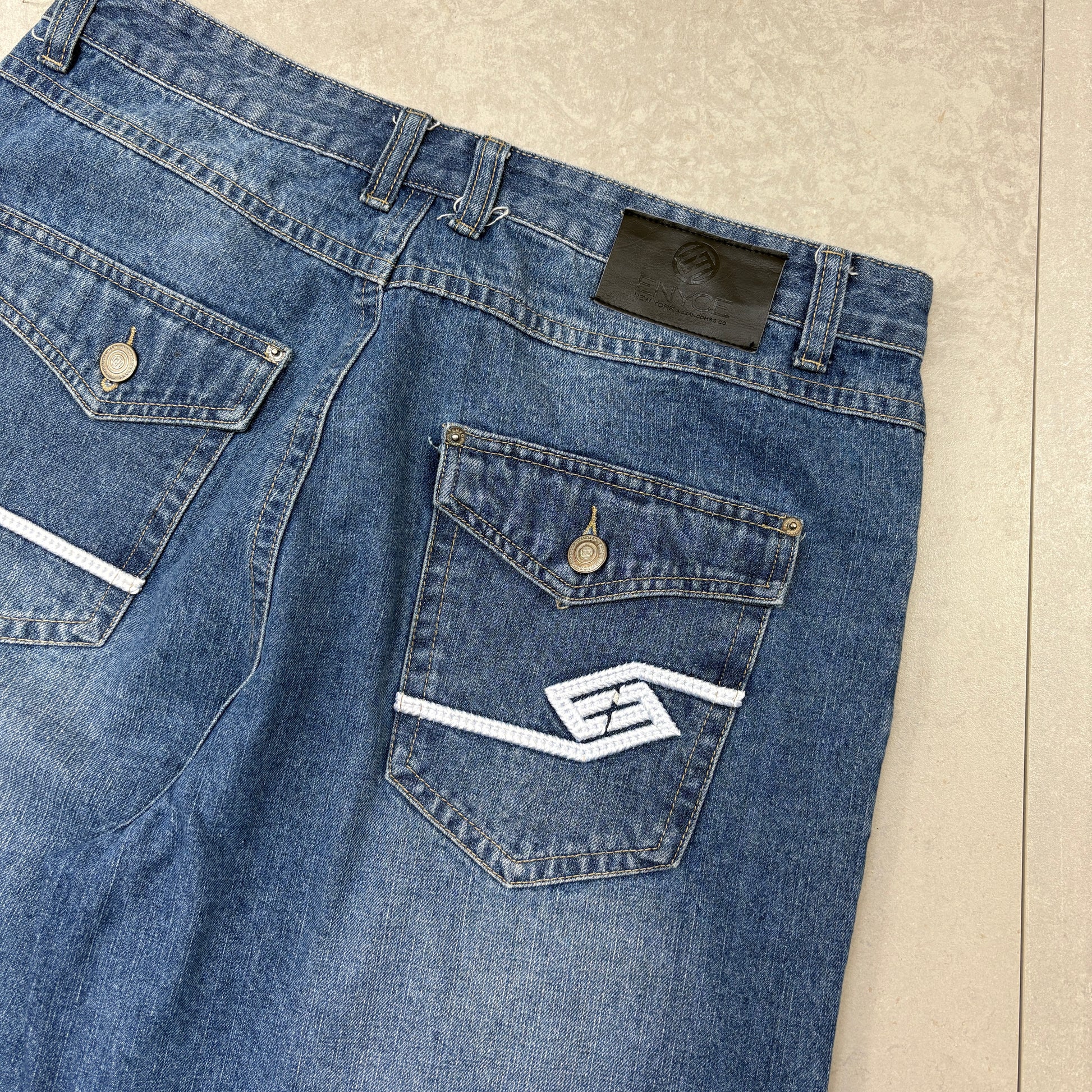 Contrast stitch true religion JNCO Coogi Southpole akademics Fubu skate rocawear embroidered denim jeans jorts skatewear surfwear carpenter cargo japanese denim