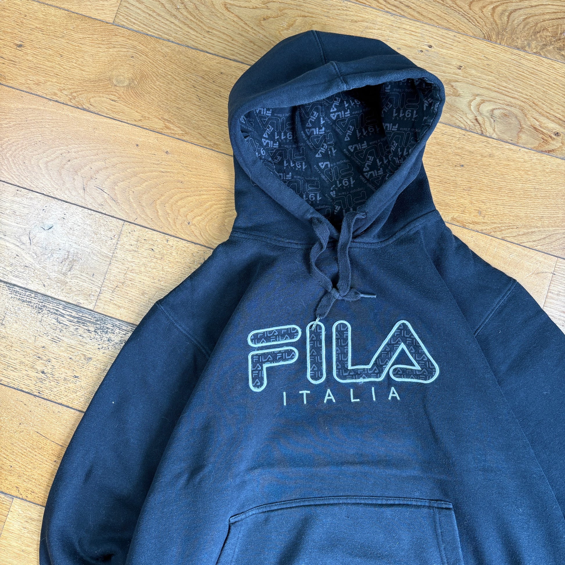 Vintage Fila Black Hoodie Embroidered Boxy Sweatshirt - XL