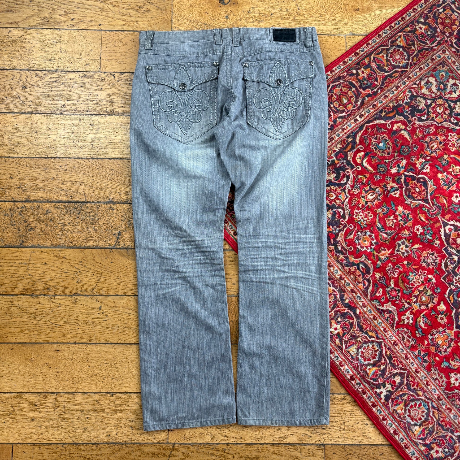 Vintage Grey Embroidered Y2K Hip Hop Baggy Jeans - 38