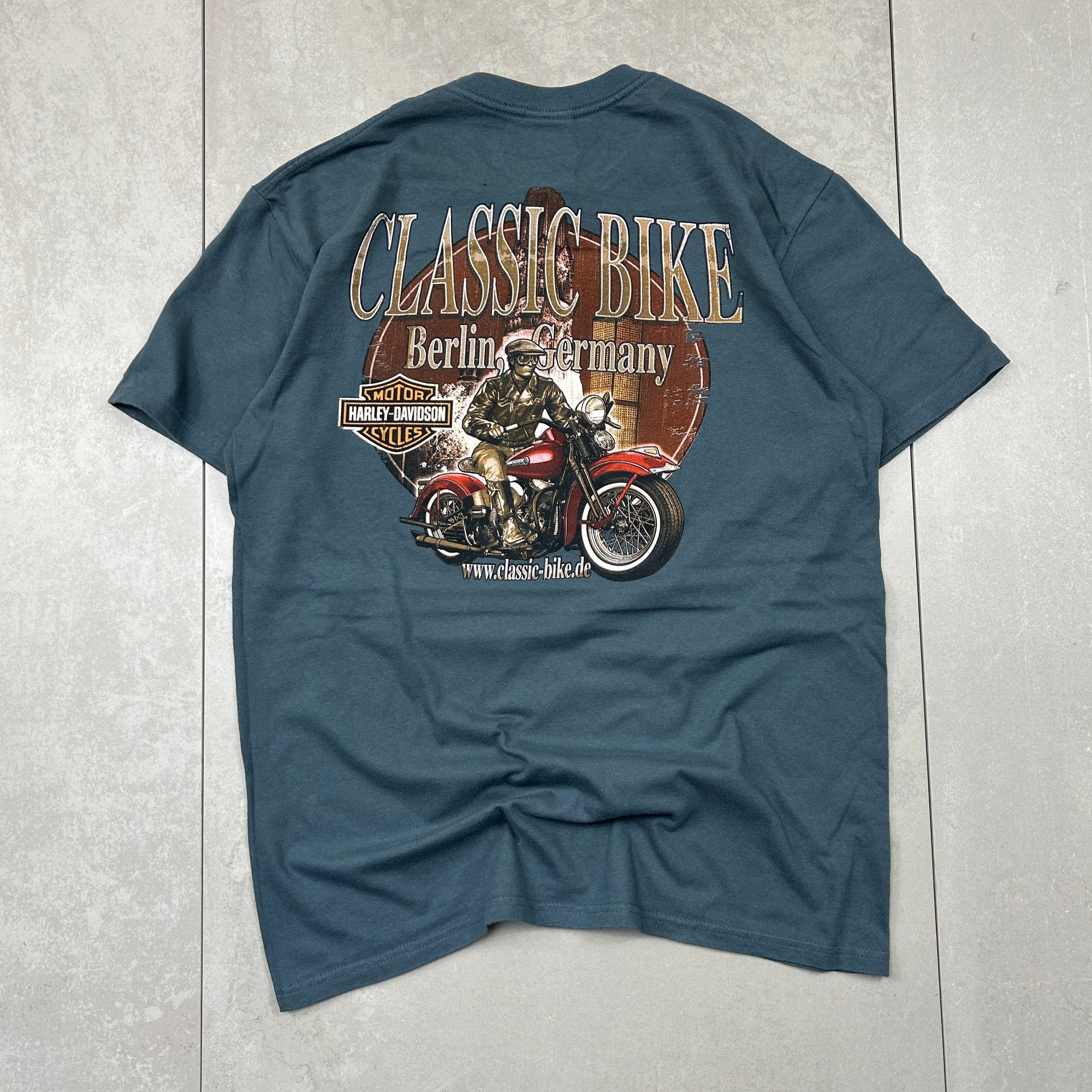 Vintage Harley Davidson Blue Motorbike Graphic T-Shirt - M