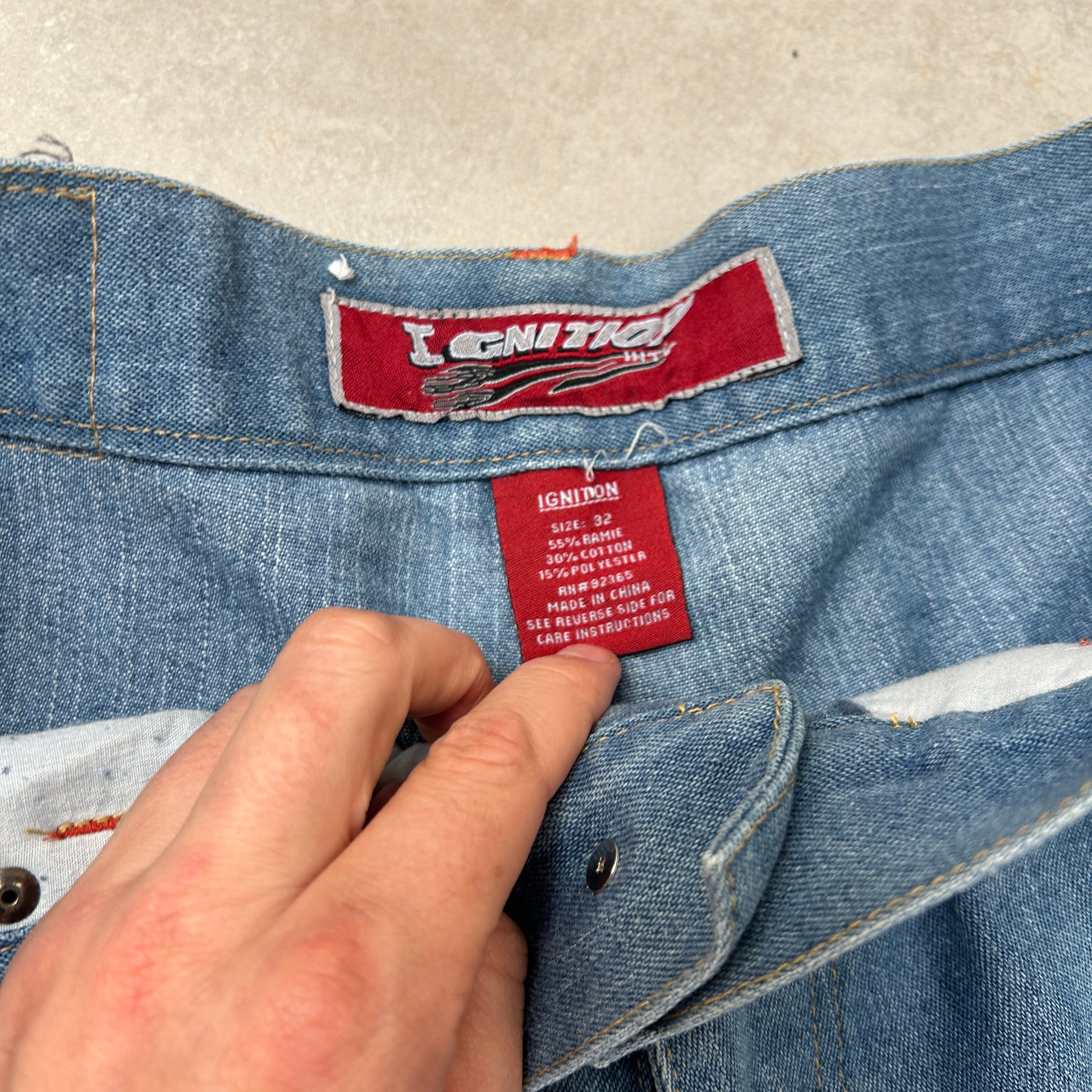Contrast stitch true religion JNCO Coogi Southpole akademics Fubu skate rocawear embroidered denim jeans jorts skatewear surfwear carpenter cargo japanese denim