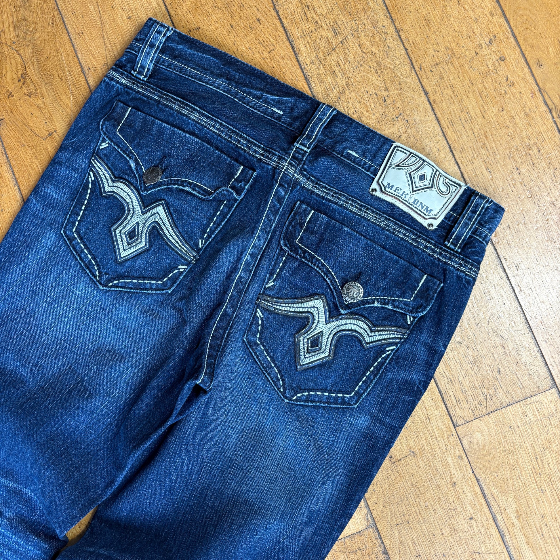 Vintage Mek Embroidered Hip Hop Blue Baggy Bootcut Jeans - 38