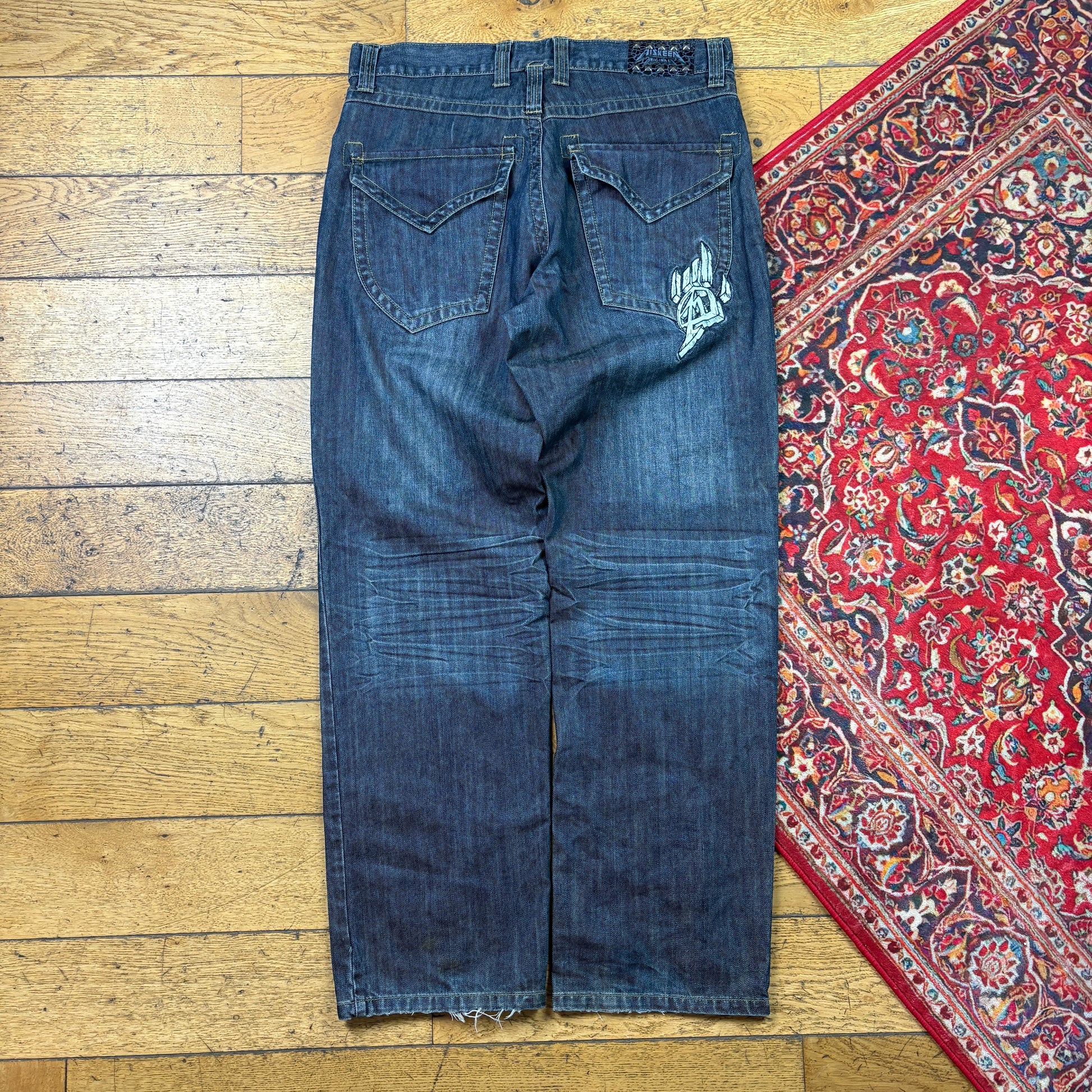 Vintage Miskeen Blue Embroidered Y2K Hip Hop Baggy Jeans - 36
