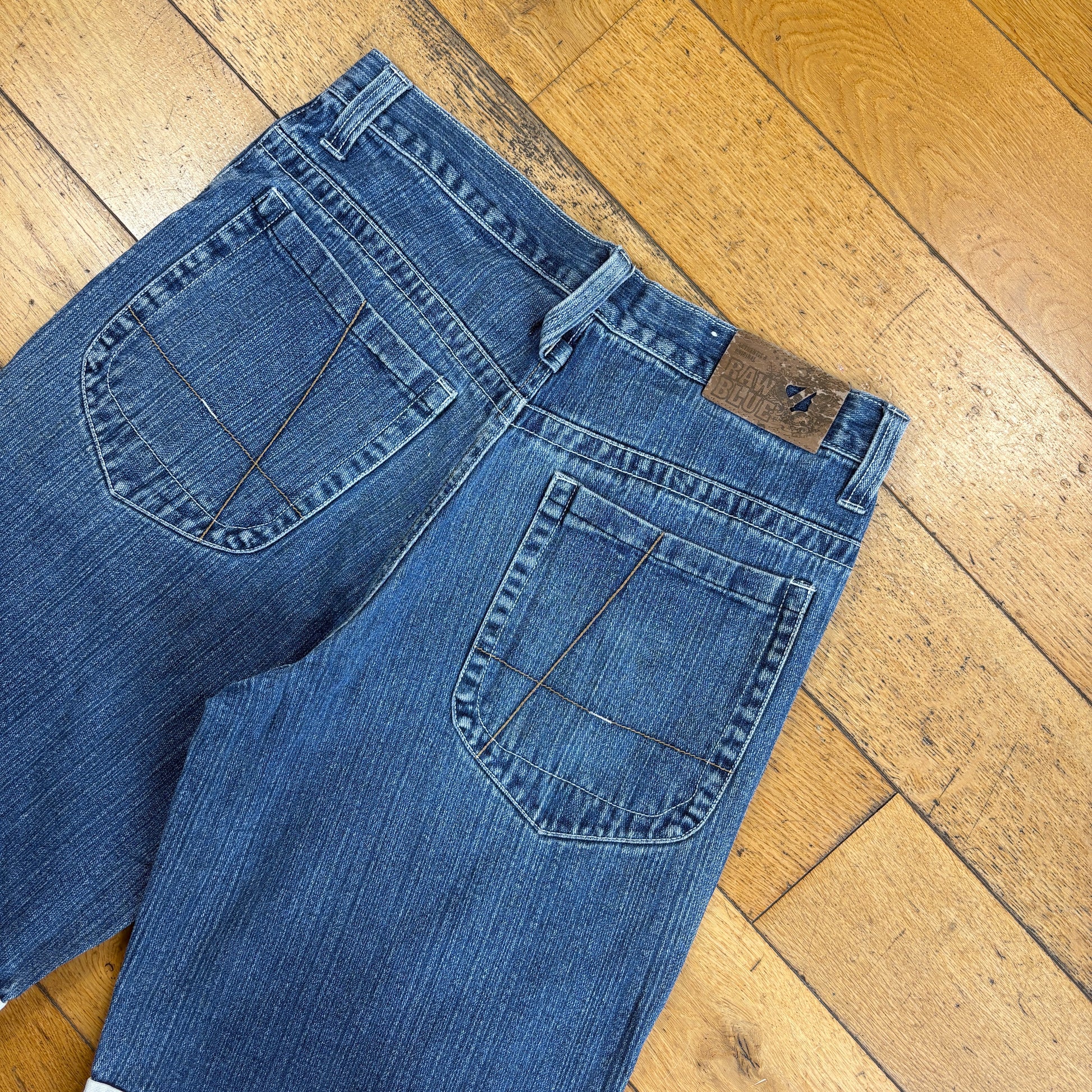 Contrast stitch true religion JNCO Coogi Southpole akademics Fubu skate rocawear embroidered denim jeans jorts skatewear surfwear carpenter cargo japanese denim