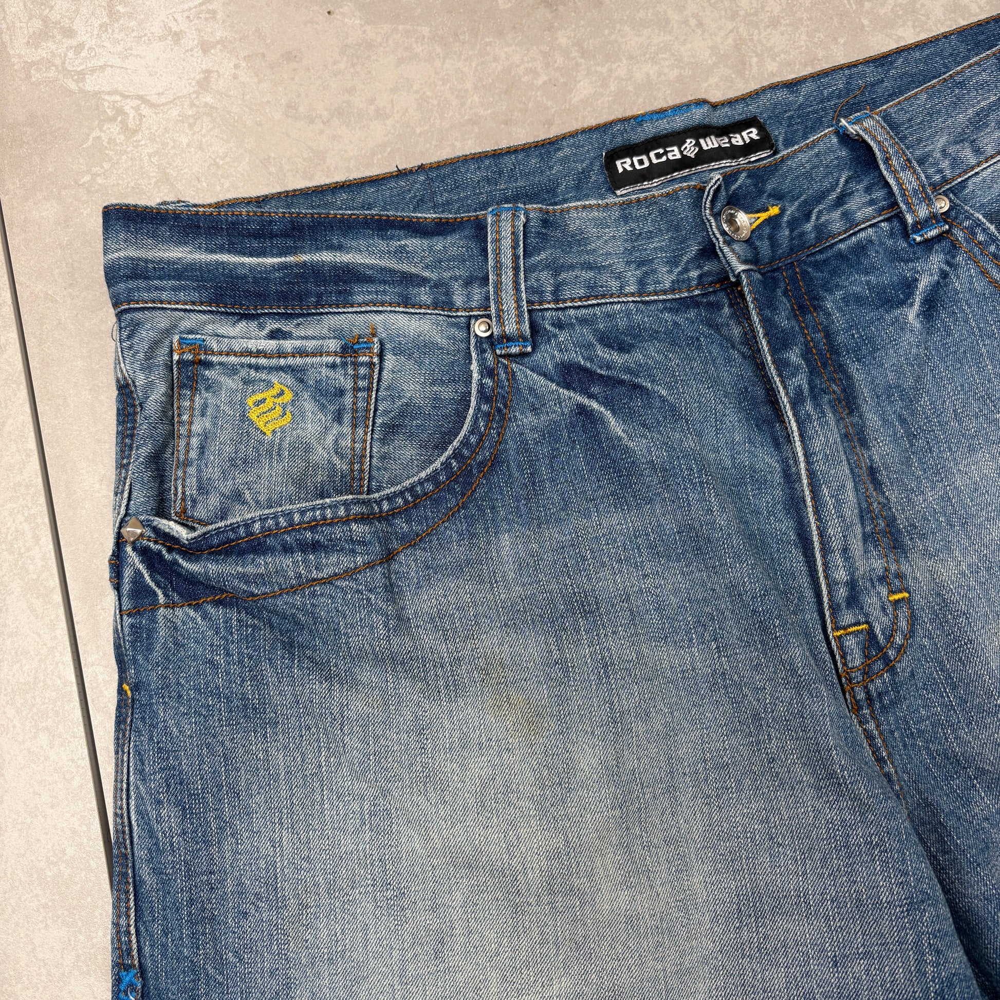 Contrast stitch true religion JNCO Coogi Southpole akademics Fubu skate rocawear embroidered denim jeans jorts skatewear surfwear carpenter cargo japanese denim