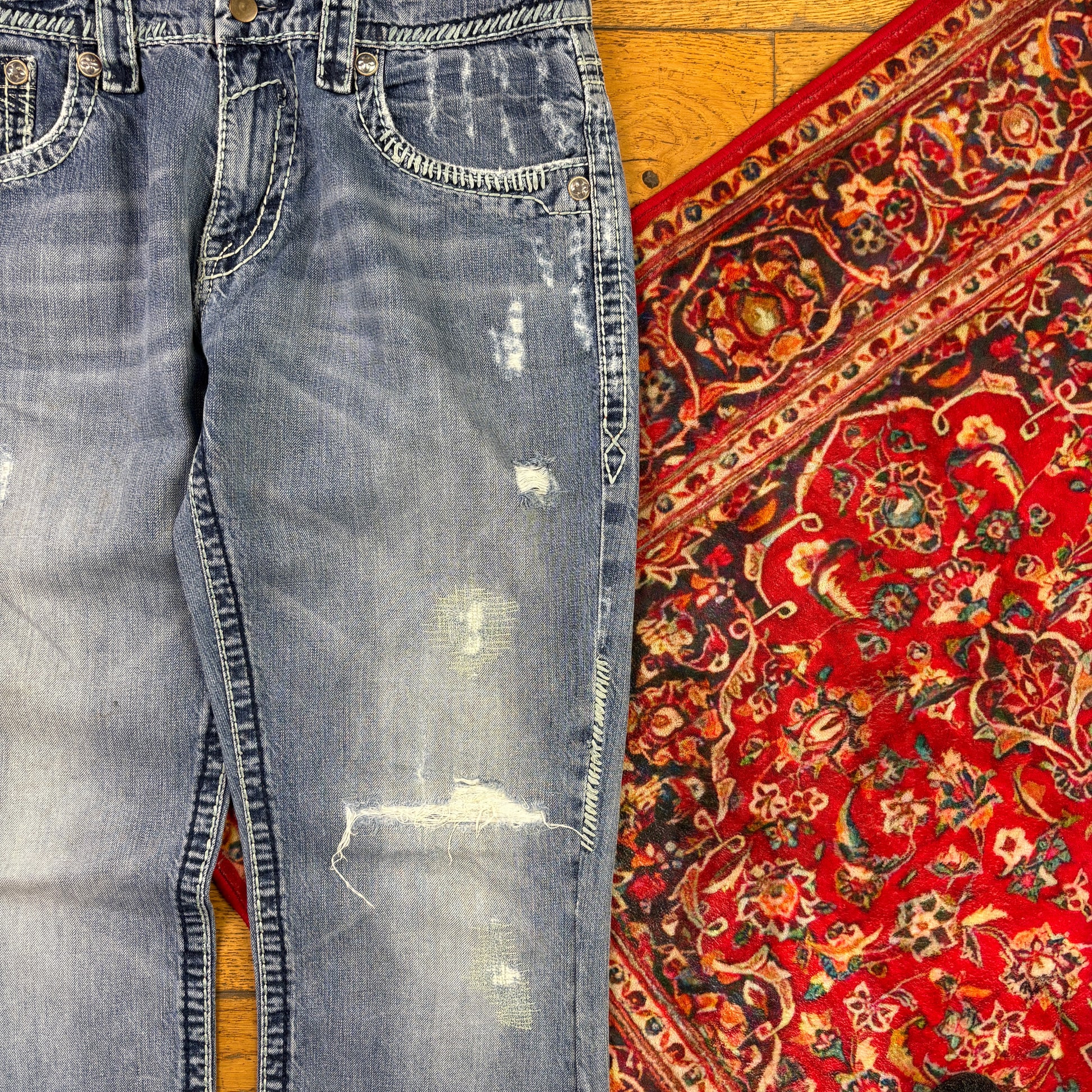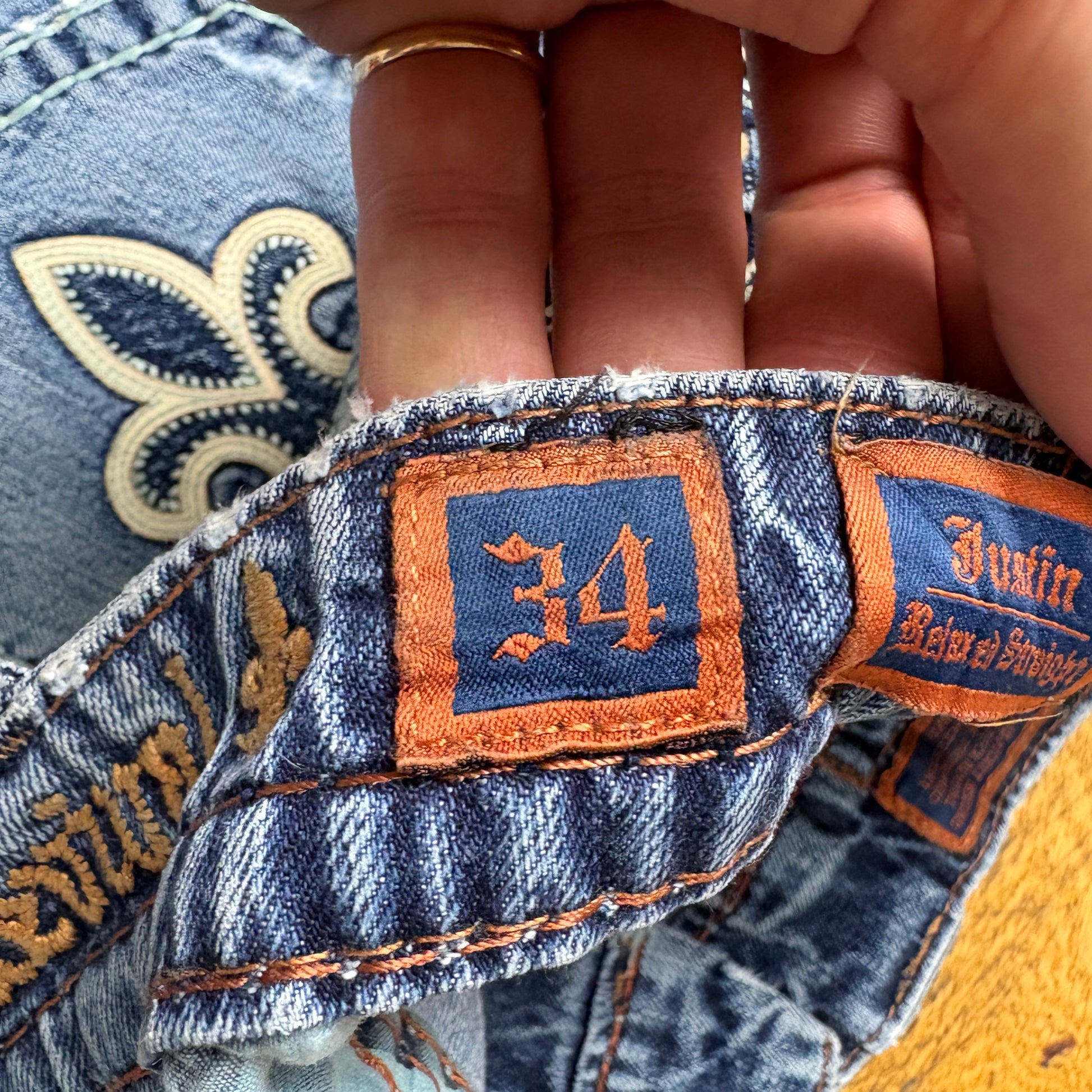 Vintage Rock Revival Blue Embroidered Y2K Hip Hop Straight Jeans - 38