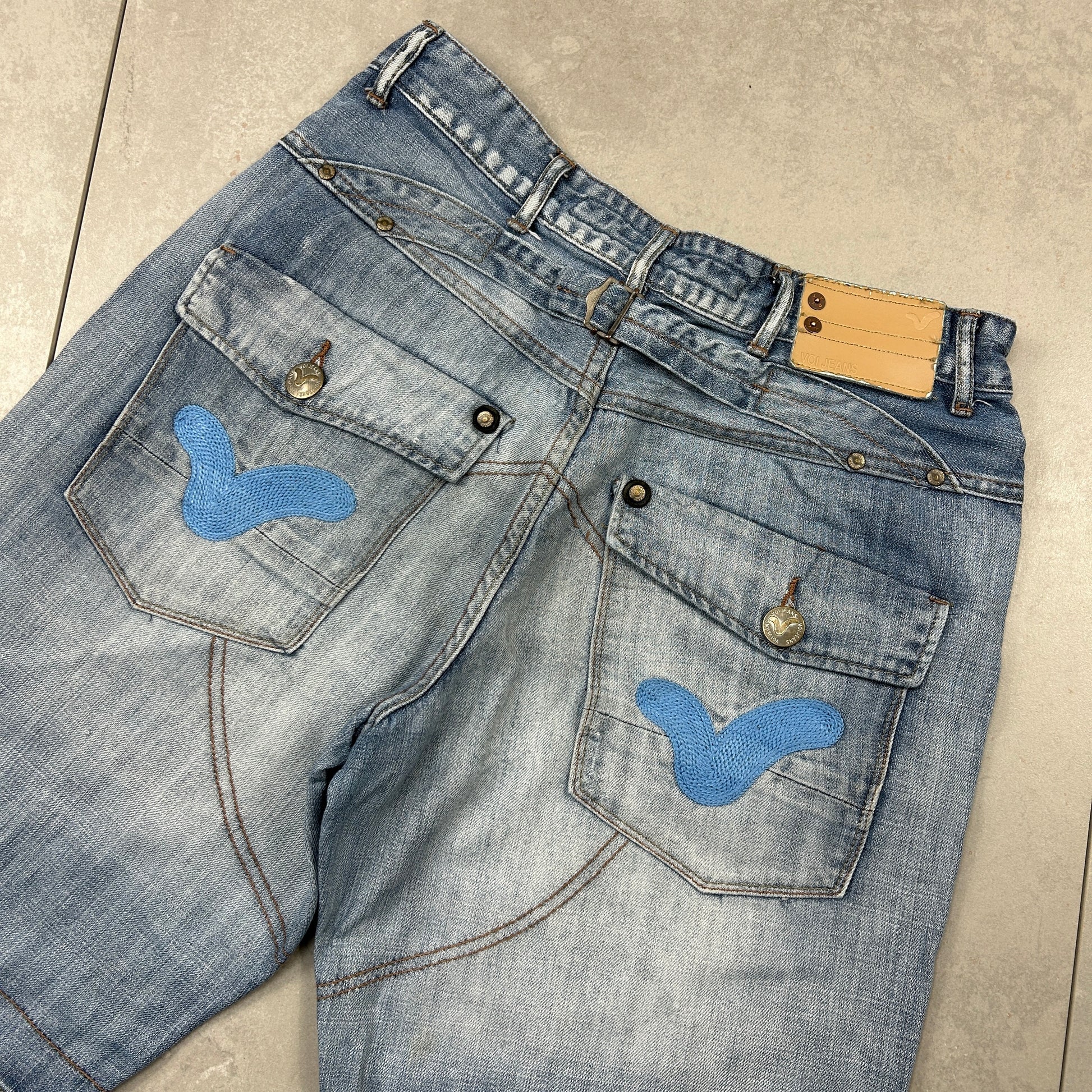 Contrast stitch true religion JNCO Coogi Southpole akademics Fubu skate rocawear embroidered denim jeans jorts skatewear surfwear carpenter cargo japanese denim