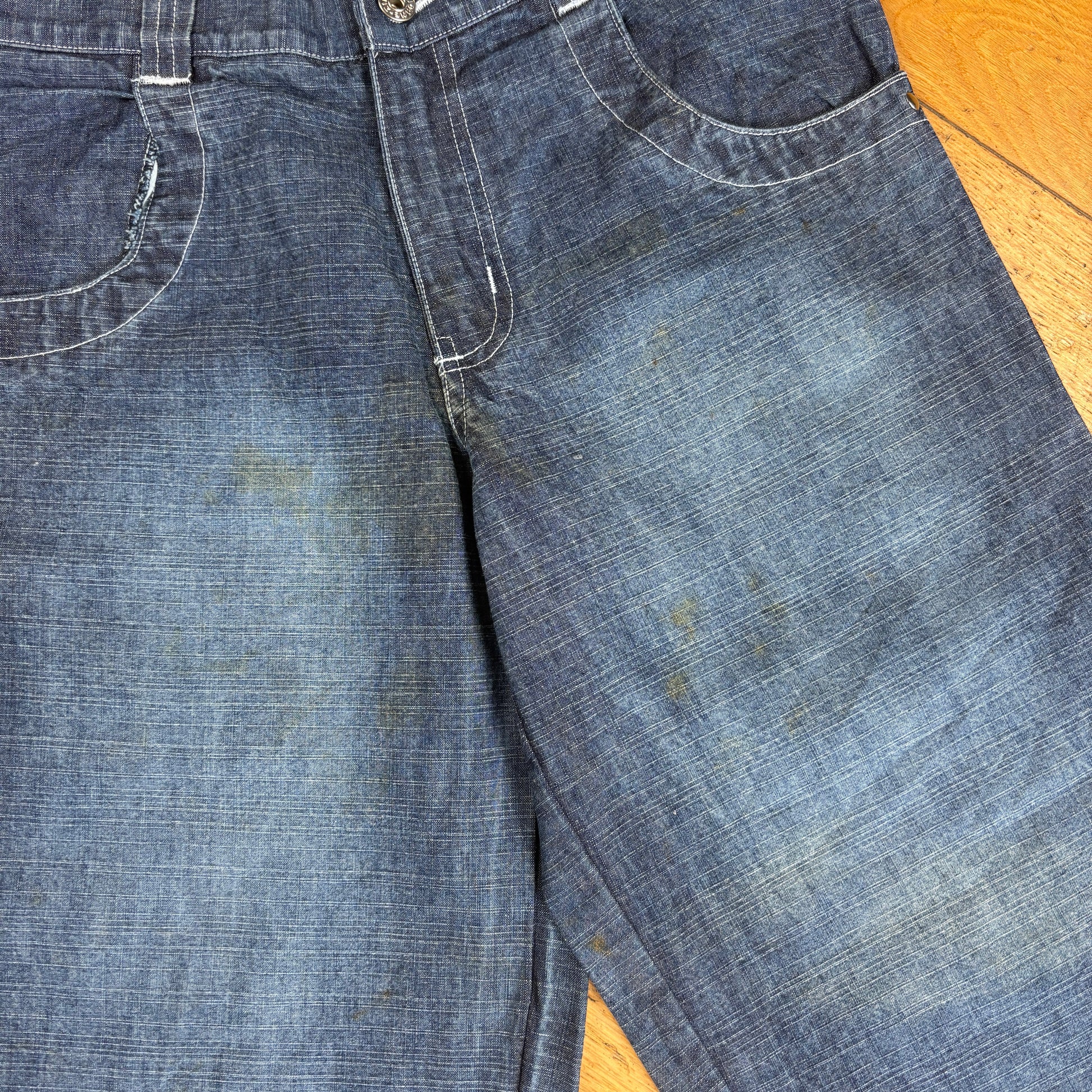 Contrast stitch true religion JNCO Coogi Southpole akademics Fubu skate rocawear embroidered denim jeans jorts skatewear surfwear carpenter cargo japanese denim